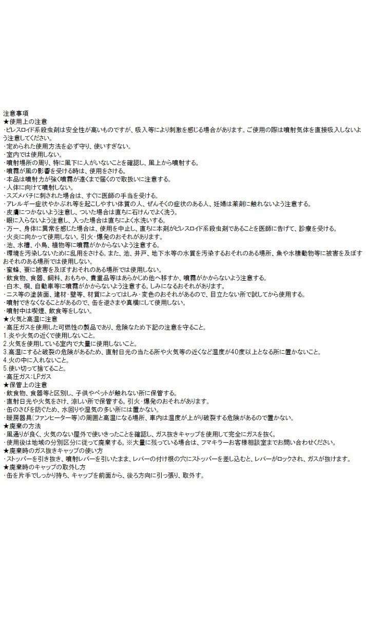 ・本品はスズメバチの巣の駆除を対象とした商品ではありません。スズメバチの巣には「カダン スズメバチバズーカジェット 550mL」を使用するか、専門の駆除業者にご相談ください。