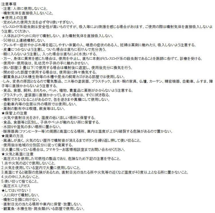 ●適用害虫:(不快害虫用)アカカミアリ、アブ、アリ、アルゼンチンアリ、アワフキムシ、ウンカ、カツオブシムシ、ガ、ガガンボ、カゲロウ、カメムシ、クモ、ゲジ、コオロギ、コガネムシ、コクヌストモドキ、コバエ、ゴミムシ、ゴミムシダマシ、シバンムシ、シロアリ、セアカゴケグモ、ゾウムシ、ダンゴムシ、チャタテムシ、ナガシンクイ、ハサミムシ、ハチ、ハムシ、ヒアリ、ムカデ、ヤスデ、ユスリカ、ヨコバイ、ワラジムシ。
