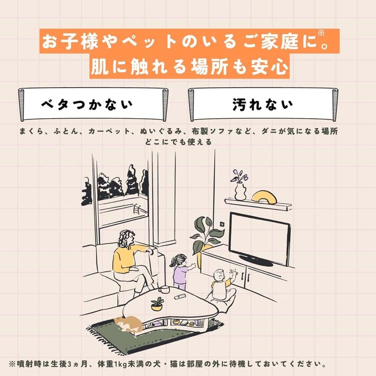 ・噴射時は生後3ヵ月、体重1kg未満の犬・猫は部屋の外に出しておいてください。