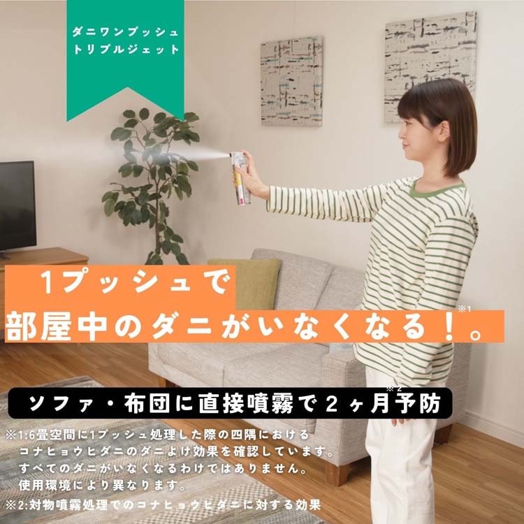 ・ダニが気になる場所(寝具、カーペット等)に約1mの距離から、2平方メートルあたり1回噴射する。