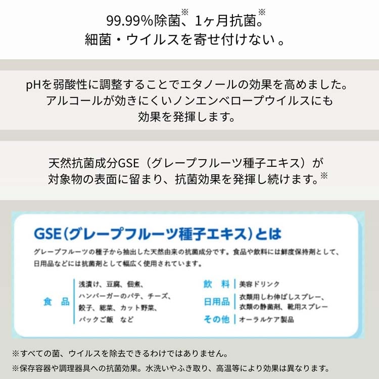 ●ナチュリアに配合された天然抗菌成分であるGSE(グレープフルーツ種子エキス)は蒸発しにくいため、アルコールが蒸発した後もまな板や包丁の表面に留まり、菌の繁殖を抑え続けます。スプレーしてそのまま乾燥させるだけで、1ヵ月にわたって清潔な状態をキープする「抗菌バリア」が完成します。