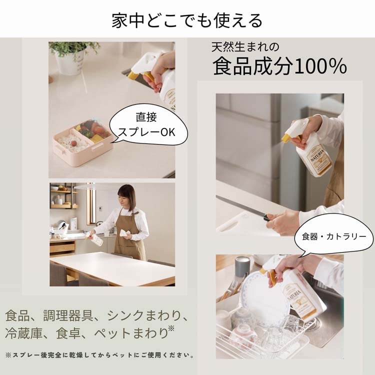 ●キッチン家電、食器、調理器具、さらにはお弁当や生鮮食品にまで直接使える「ナチュリア」は、どこでもこれ1本で対応できる非常に便利な除菌※スプレーです。ふき取りや水洗いも不要。乾燥させるだけの手軽さで、忙しい毎日の家事を劇的にスムーズにします。