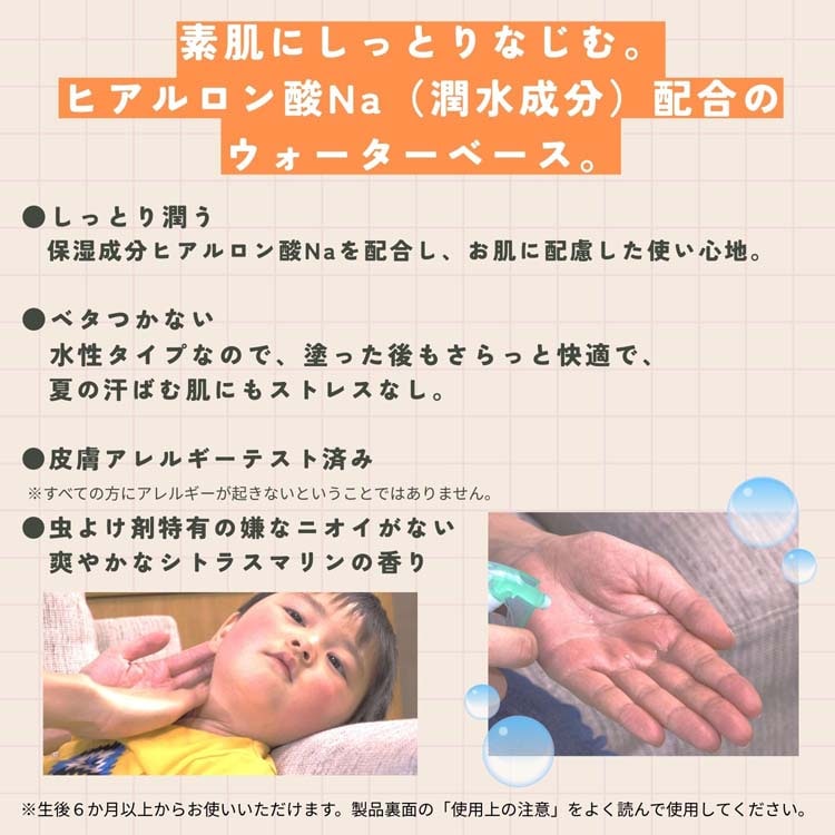 ●しっとり水性タイプ:虫よけ成分を10%配合しつつ、潤水成分ヒアルロン酸Naを配合。水性タイプで素肌にしっとりなじみ、ベタつきが少なく、どなたでもお使いいただけます。