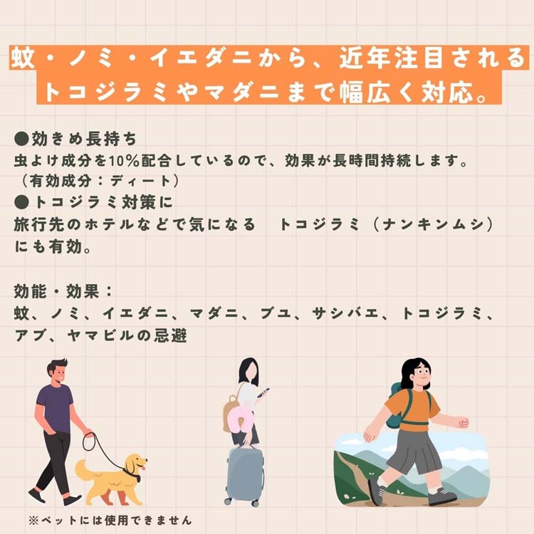 ●幅広い害虫に長時間効果:虫よけ成分10%配合により、効果が持続。危険なマダニやヤマビルなど、幅広い害虫をしっかりガードします。