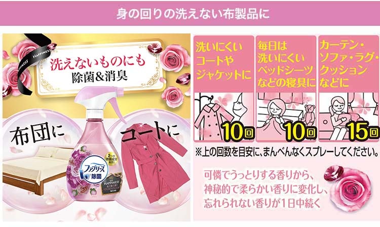 ●ファブリーズ消臭・除菌に、人気の柔軟剤レノアハピネスと同じ香りが1日中続く。柔軟剤以上・香水未満の贅沢な香りがゆっくりと香ります。