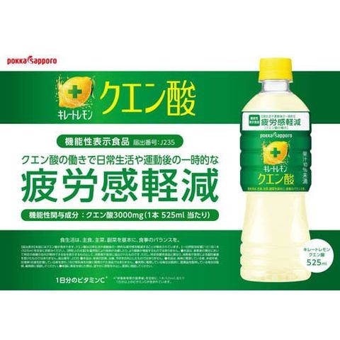 | 525ml当り エネルギー:86kcal、たんぱく質:0g、脂質:0g、炭水化物:22.4g、食塩相当量:0.3g、ビタミンC:100~1297mg 機能性関与成分 クエン酸:3000mg |