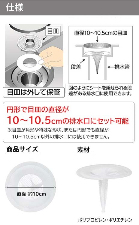 ・目皿が角型や特殊な形状、または円形でも直径が10-10.5cm以外の排水には使用できません。また、排水口内に本品を水平に設置できない場合も使用できません。