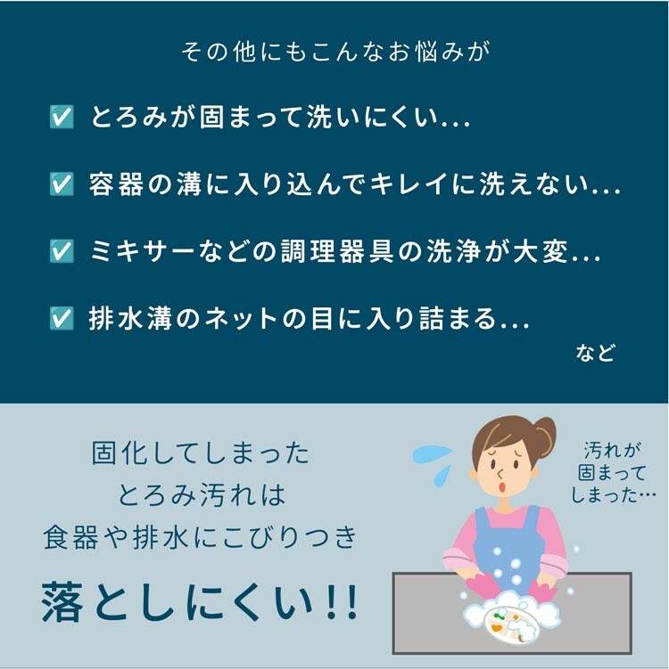 ●とろみ汚れに特化した酵素を配合しており、とろみ汚れを強力分解