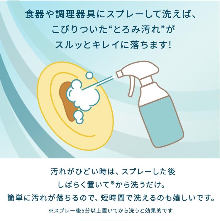・とろみ剤が固着した箇所には直接スプレーしたのち、5分以上おいてからスポンジで洗う。