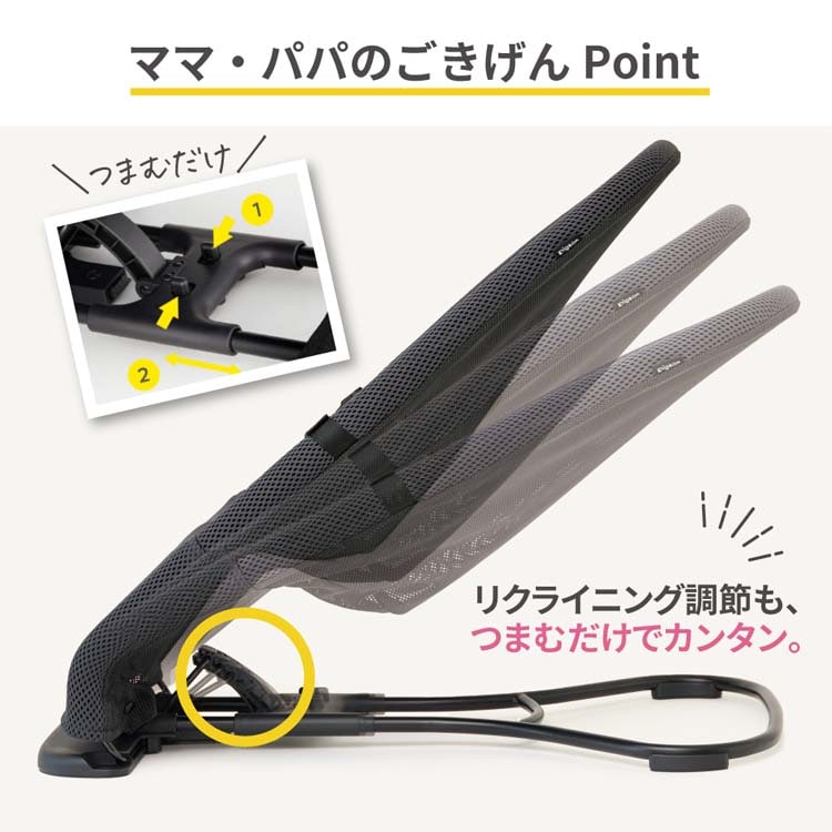 ・リクライニング調節も、つまむだけでカンタン。2アクションで、ラクにスライドできます。