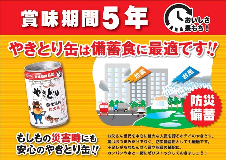●国産鶏肉を炭火で焼き上げた大容量のホテイのやきとりです。賞味期間5年で防災備蓄にぴったりです。