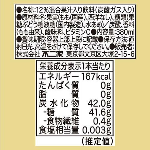 | 果実(もも(国産)、西洋なし)、糖類(果糖ぶどう糖液糖(国内製造)、水あめ)/炭酸、香料(もも由来)、酸味料、ビタミンC |