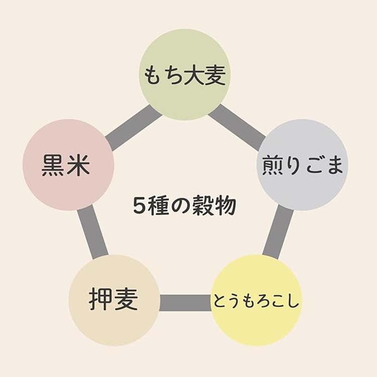 ●大麦をベースに5種類の穀物(大麦・とうもろこし・黒米・黒ごま・白ごま)をバランスよく配合しました。
