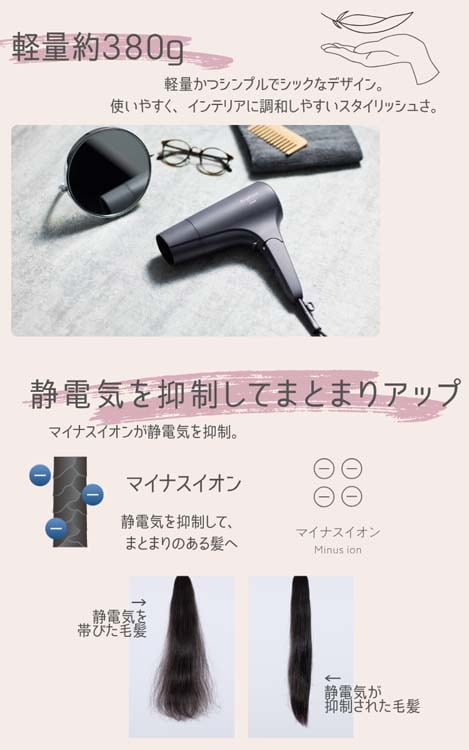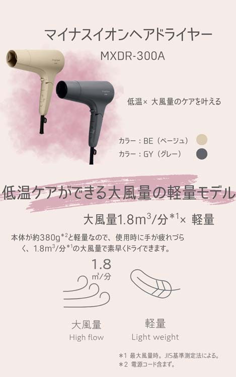 ●低温×大風量のケアができる、マイナスイオンヘアドライヤー。風の種類が選べる軽量モデル。