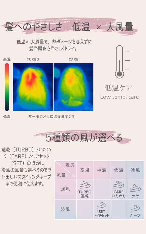 ●髪へのやさしさ、低温×大風量