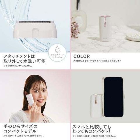 | サイズ(約):W41×D25×H85mm 重量:約82g(本体・キャップ・乾電池含む) カラー:ホワイト 電源:乾電池式 単4形アルカリ乾電池×2本 ※別売 連続使用可能時間:週2回(1回約5分間)の使用で約1ヶ月使用可能 水洗い構造:アタッチメントのみ水洗い可 スイッチ:ロック付きスイッチ(OFF/ON) 刃:2枚刃の往復式 使用できる部位:ボディ、うなじ、脇、腕、脚、指、顔 LEDライト:有 |