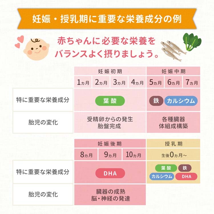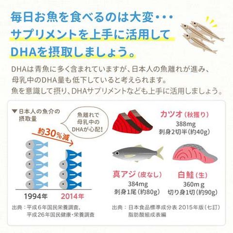 ●DHAは主に魚の油に含まれる栄養素で、妊娠期と授乳期の摂取が推奨されています。