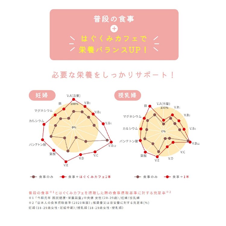 | (1本(20g)当たり) エネルギー:87kcal、たんぱく質:1.84g、脂質:3.30g、炭水化物:13.60g、食塩相当量:0.17g 食物繊維:1.25g、ビタミンA:150μg、ビタミンB1:0.20mg、ビタミンB2:0.24mg、ビタミンB6:0.24mg、ビタミンB12:0.24μg、ビタミンC:30mg、ビタミンD:3.0μg、ビタミンE:1.3mg、ナイアシン:2.0mg、パントテン酸:1.0mg、葉酸:160μg、カリウム:123mg、カルシウム:150mg、鉄:3.5mg、マグネシウム:35mg、リン:54mg、リノール酸:480mg、α-リノレン酸:48mg、ラクチュロース:90mg、ガラクトオリゴ糖:100mg、無水カフェイン:0mg |