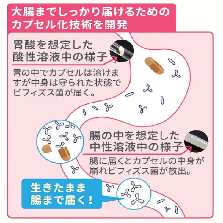 ビフィズス菌末(澱粉、ビフィズス菌乾燥原末)(国内製造)、乳蛋白質消化物、澱粉/HPMC、アルギン酸Na、ステアリン酸Ca、カラメル色素、炭酸Ca、リン酸Ca、葉酸、(一部に乳成分を含む)