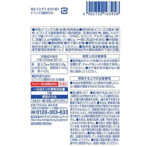 届出表示:本品にはビフィズス菌BB536が含まれます。ビフィズス菌BB536には、大腸の腸内環境を改善し、腸の調子を整える機能が報告されています。