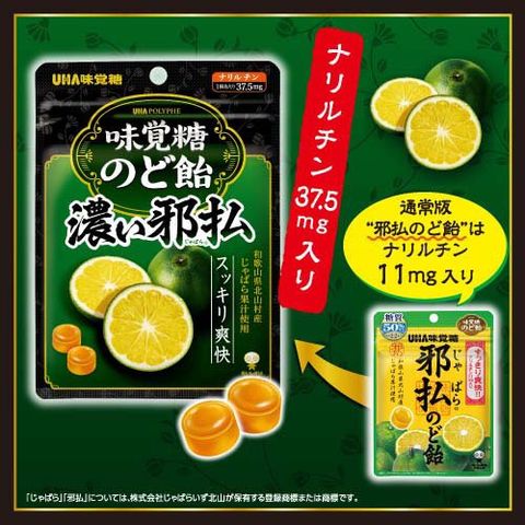 ●味覚糖のど飴 濃い邪払はナリルチン量が37.5mgと通常版 邪払のど飴より3倍多く含まれています。