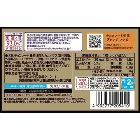 | 1枚(5g)当たり エネルギー:29kcal、たんぱく質:0.7g、脂質:2.3g、炭水化物:1.8g、糖質:1g、食物繊維:0.8g、食塩相当量:0g、カカオポリフェノール:147mg/1枚 |