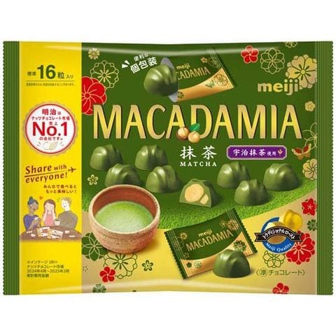 | 砂糖(外国製造)、植物油脂、マカダミアナッツ、乳糖、全粉乳、ココアバター、まっ茶、脱脂粉乳/乳化剤、酸化防止剤(V.C、V.E、ローズマリー抽出物)、着色料(クチナシ、フラボノイド)、香料、(一部に乳成分・大豆・マカダミアナッツを含む) |