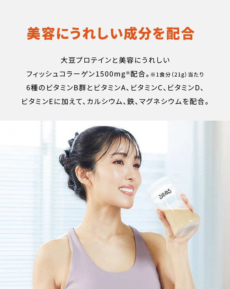 ●たんぱく質として引き締まったカラダづくりをサポートする大豆プロテインとコラーゲン、さらにカラダづくりに必要なビタミン・ミネラルを配合したチョコレート風味の粉末プロテインなので、美しく引き締めたいカラダづくりをサポートできる。