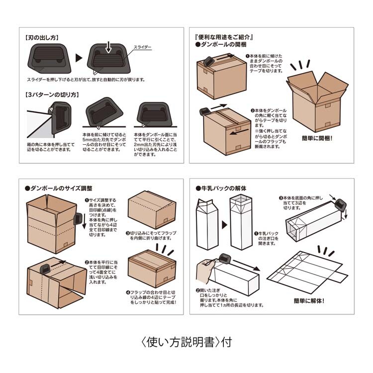 ●ダンボールの開梱やリサイズ、さらに牛乳パックの解体といった毎日のように必要なカット作業を安全に、そしてスマートにサポートします。