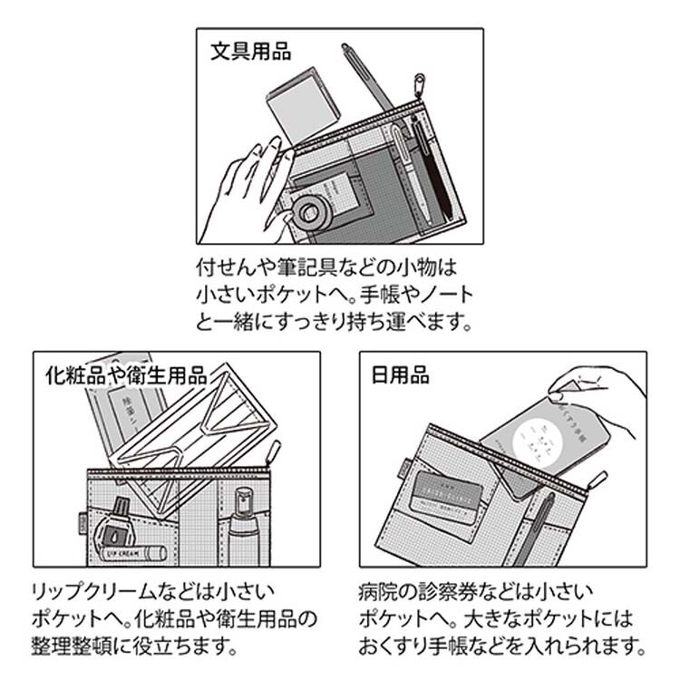 ●ポケット部分の上部を斜めにすることで、小さい物も取り出しやすくしており、文具を入れるポーチとしてだけでなく、様々な用途でお使いいただけます。