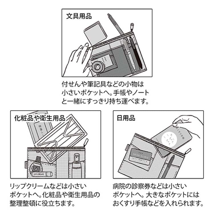 ●ポケット部分の上部を斜めにすることで、小さい物も取り出しやすくしており、文具を入れるポーチとしてだけでなく、様々な用途でお使いいただけます。
