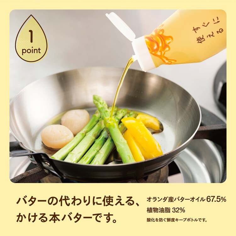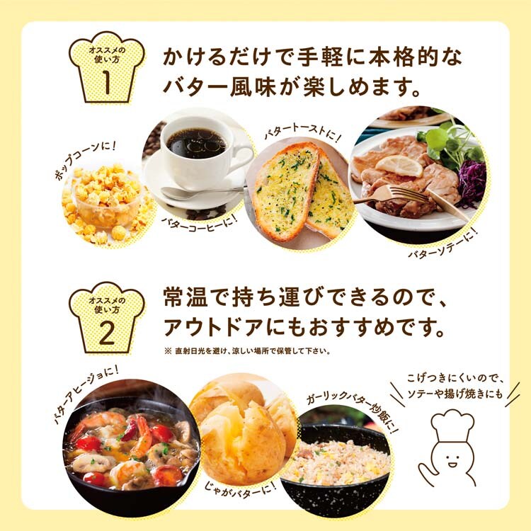 ・油は加熱しすぎると発煙、発火します。加熱の際は、その場を離れないで下さい。(バターオイル67.5%含有、香料不使用)