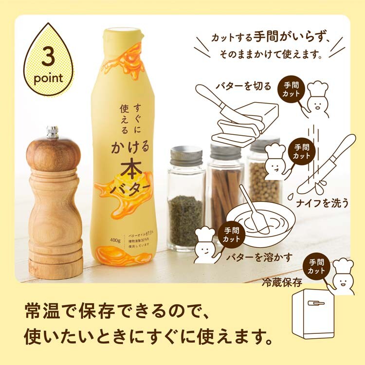 液状なので、サッとかけるだけでトーストやバターコーヒー、料理に手軽にお使い頂けます。