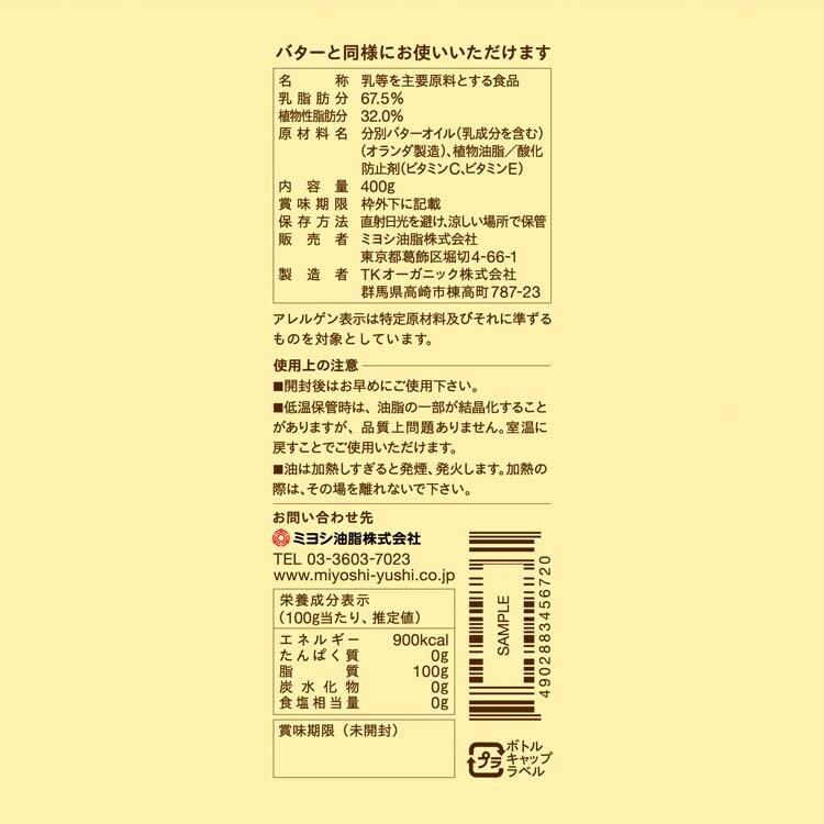 | 分別バターオイル(乳成分を含む)(オランダ製造)、植物油脂/酸化防止剤(V.E、V.C、ヤマモモ抽出物) |
