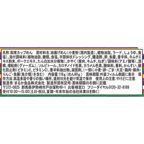 | 油揚げめん(小麦粉(国内製造)、植物油脂、ラード、しょうゆ、食塩)、添付調味料(植物油脂、糖類、食塩、半固体状ドレッシング、醸造酢、卵、魚醤、香辛料、キムチエキス粉末、ポークエキス、たん白加水分解物)、かやく(豚肉、キムチ、ねぎ)/調味料(アミノ酸等)、酒精、増粘剤(グァーガム)、ソルビトール、カロチノイド色素、カラメル色素、酸味料、香料、かんすい、酸化防止剤(ビタミンE、ビタミンC)、香辛料抽出物、凝固剤、(一部に小麦・卵・ごま・大豆・鶏肉・豚肉・りんご・魚醤(魚介類)を含む) |