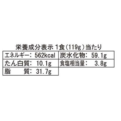 | 1食(119g)当たり エネルギー:562kcal、たん白質:10.1g、脂質:31.7g、炭水化物:59.1g、食塩相当量:3.8g |