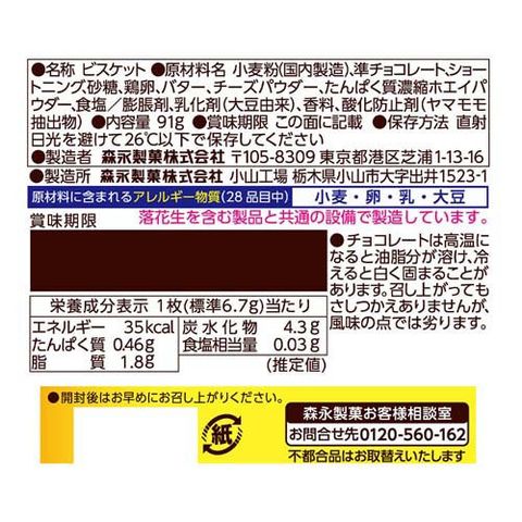| 小麦粉(国内製造)、準チョコレート、ショートニング、砂糖、鶏卵、バター、チーズパウダー、たんぱく質濃縮ホエイパウダー、食塩/膨脹剤、乳化剤(大豆由来)、香料、酸化防止剤(ヤマモモ抽出物) |