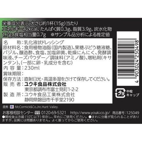 食用植物油脂(国内製造)、果糖ぶどう糖液糖、バジル、醸造酢、食塩、加塩卵黄、乾燥にんにく、発酵調味液、チーズパウダー/調味料(アミノ酸)、増粘剤(キサンタン)、(一部に卵・乳成分を含む)