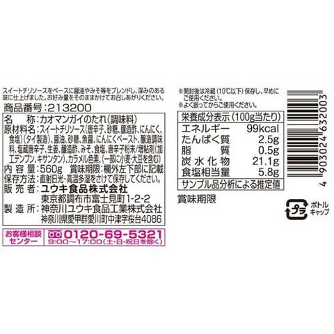| スイートチリソース(唐辛子、砂糖、醸造酢、にんにく、食塩)、醤油、砂糖、魚醤(魚介類)、にんにくペースト、醸造調味料、塩漬唐辛子、しょうが、醸造酢、みそ、食塩、唐辛子、増粘剤(加工でん粉、キサンタン)、カラメル色素、(原材料の一部に小麦、大豆を含む) |