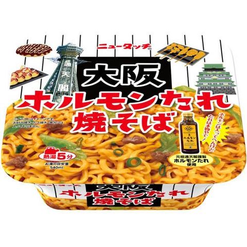 | 油揚げめん(小麦粉(国内製造)、植物油脂、ラード、食塩、植物性たん白、しょうゆ)、ソース(糖類、ホルモン焼のたれ、食塩、しょうゆ、ニンニクペースト、植物油脂、みそ、コチュジャン、ポークエキス、りんご果汁、香辛料)、かやく(キャベツ、味付肉そぼろ、ねぎ、唐辛子)/加工でん粉、酒精、調味料(アミノ酸等)、カラメル色素、香料、かんすい、酸味料、酸化防止剤(ビタミンE、ローズマリー抽出物)、増粘剤(キサンタン)、(一部に小麦・卵・ごま・大豆・鶏肉・豚肉・りんごを含む) |