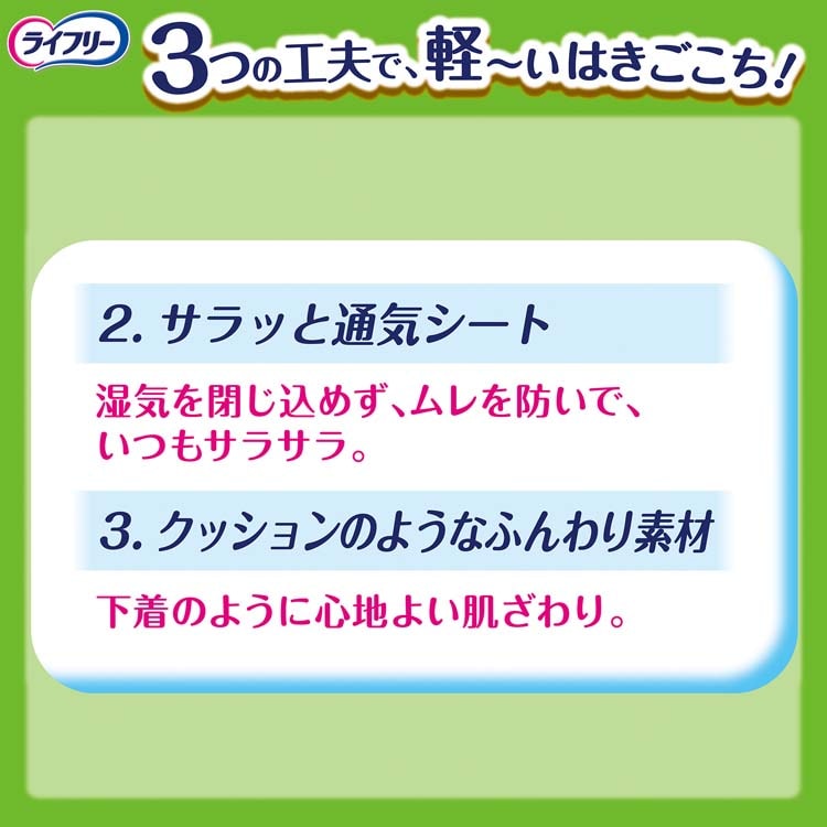 ●超うす吸収体なので下着のようにすっきりフィットし、全面通気シートで、ムレずにさらさら、見た目もはきごこちもすっきり。