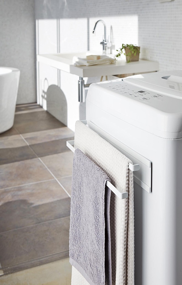 ●干す場所に困るバスタオルやバスマットなどを、洗濯機横に強力磁石でスリムに収納