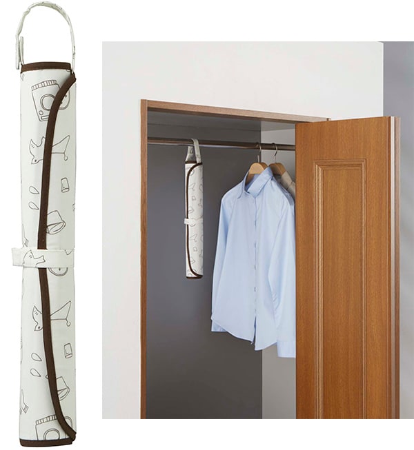 ●簡単に広げてアイロン台マットに早変わり。アイロン掛けの後は巻物のようにくるくる丸めて、面ファスナーで留めるだけの簡単収納