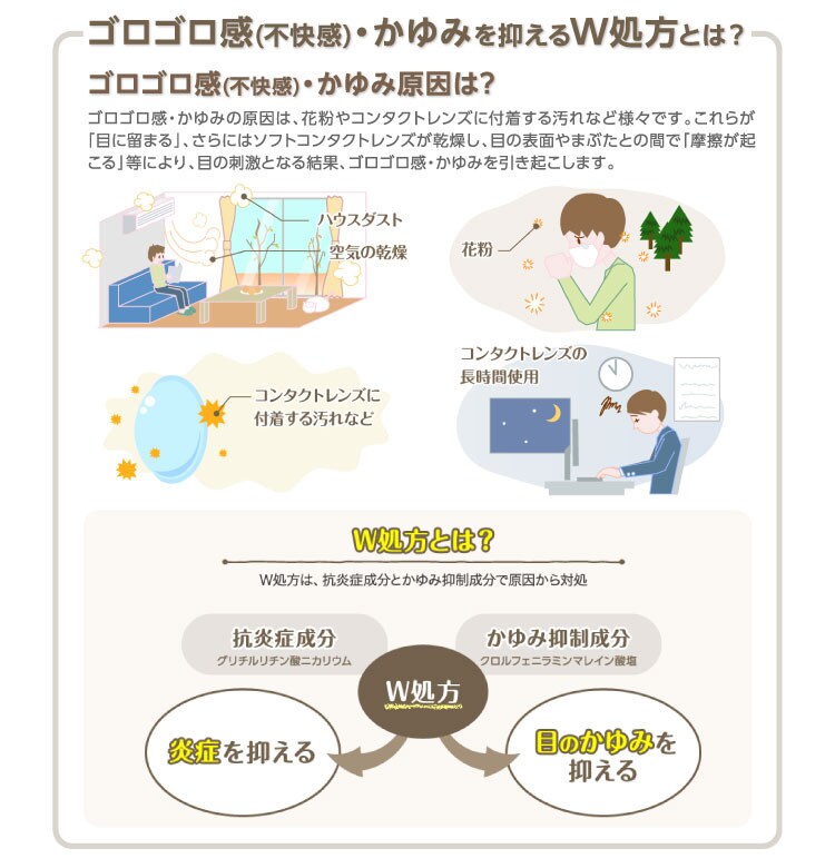 ●コンタクトを外したくなるつらいゴロゴロ感(不快感)・かゆみに。W処方が効く
