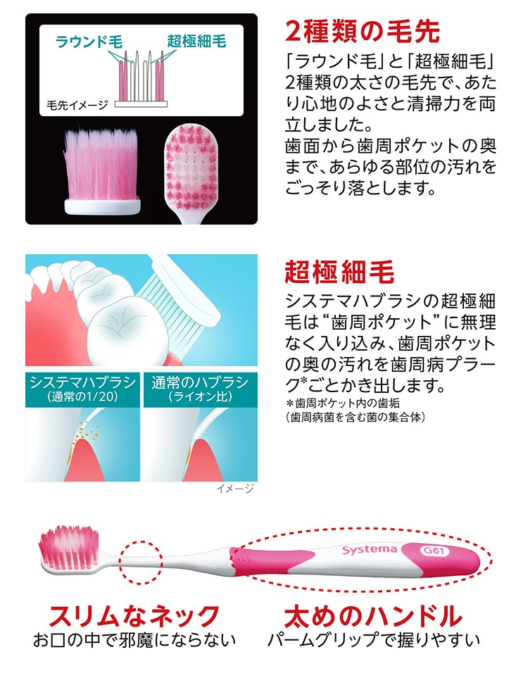 ●超極細毛とラウンド毛の2種類の毛先で、当たり心地よく、歯面から歯周ポケットの奥まで、あらゆる部位の汚れをごっそり落とせます。