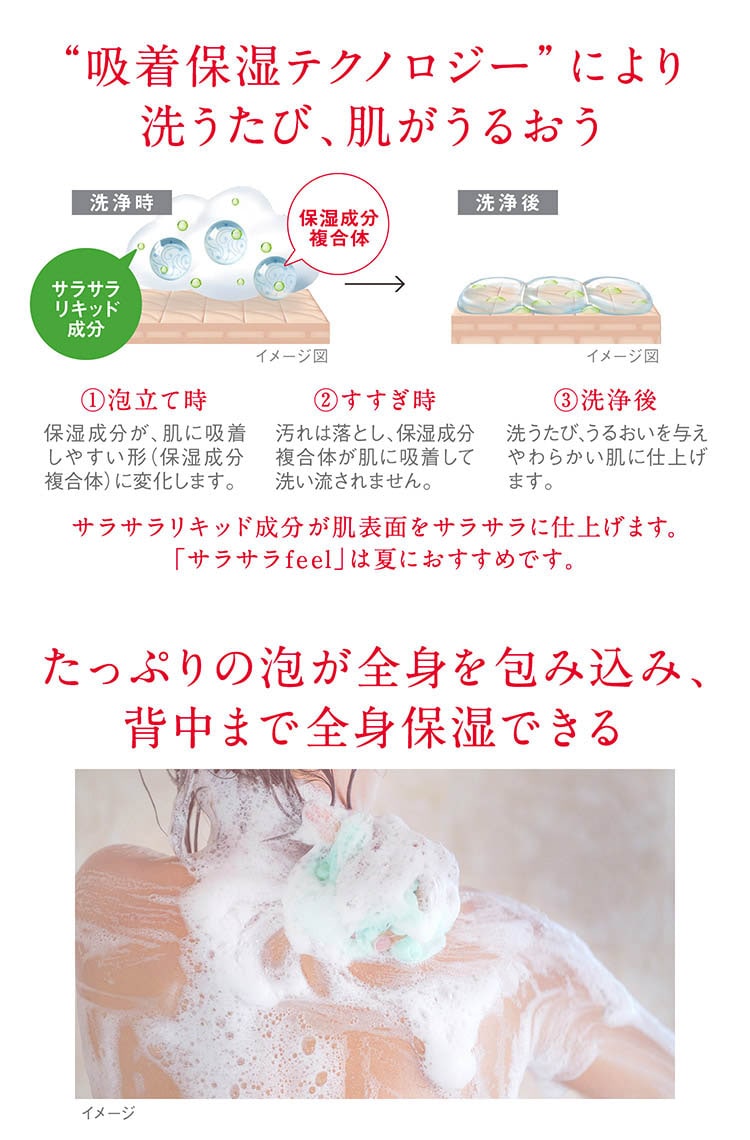 ●「吸着保湿テクノロジー」で保湿成分が肌にしっかり吸着。汚れは落とし、洗うたび全身にうるおいを与えます。