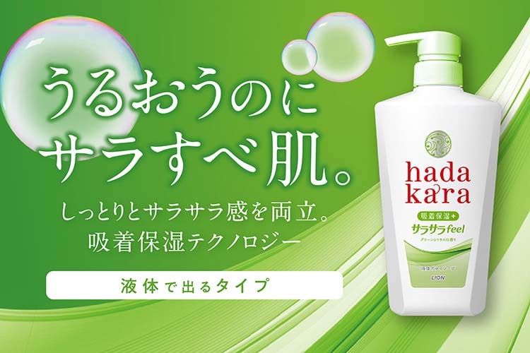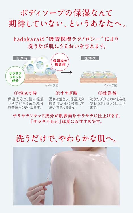 吸着保湿テクノロジーで保湿成分が洗い流されない※ボディソープ「ハダカラ」のサラサラfeelタイプ。