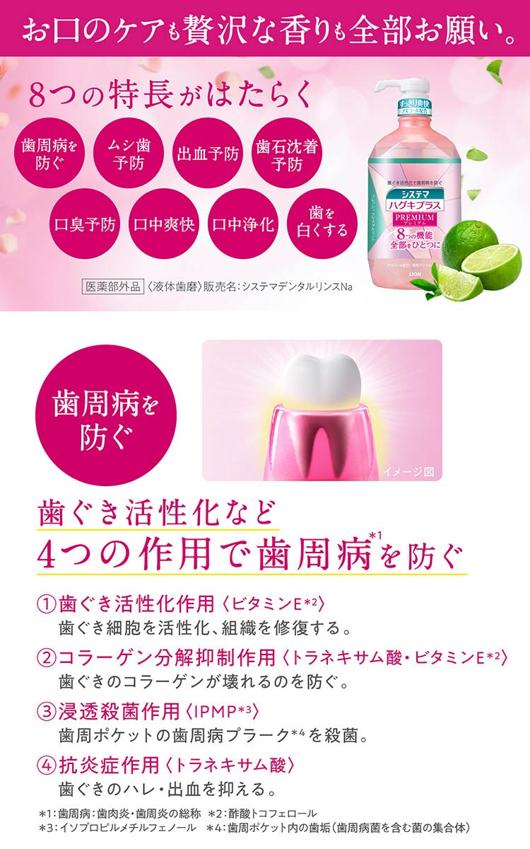 ●歯ぐきを活性化し歯周病を防ぐと共に、8つの機能全部がひとつになったプレミアム処方のデンタルリンス