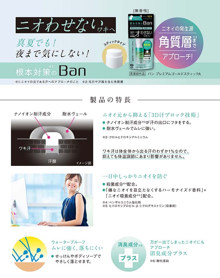 ●ニオイの発生源、角質層までアプローチする3D汗ブロック技術で、ニオイ元から抑える。根本対策のBan。
