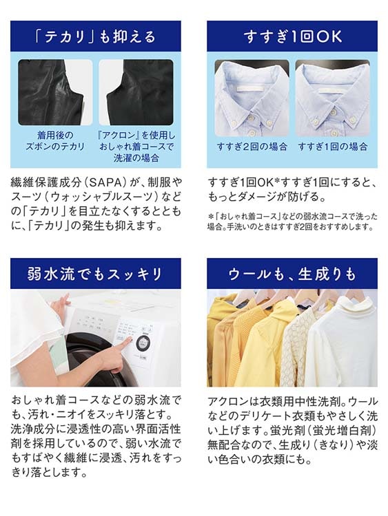 ●洗うことで制服やスーツ※2などのテカリを目立たなくし、着用時のテカリの発生を抑えます。